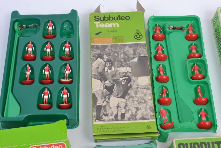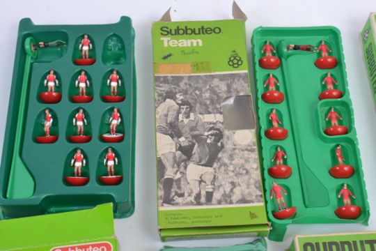 SUBBUTEO; 5x vintage Subbuteo table top football gaming teams, box numbers; 774, 4, 67, 166 and another. Most are complete.