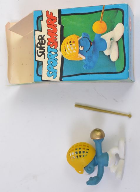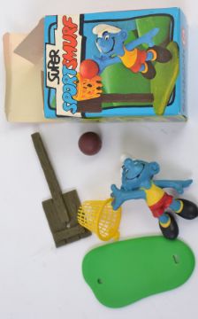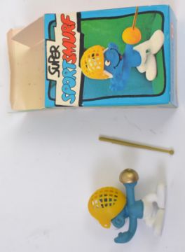SMURFS; A great collection of 5x vintage original Schleich ' Super Sport Smurf ' figures, each within the original boxes; Fencer, Basket Ball, Hurdler, Bars Gymnast, and Weightlifter.