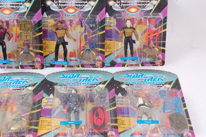 STAR TREK; A collection of 10x Star Trek The Next Generation carded action figures by Ban Dai / Playmates. Each unopened, and all unpunched.