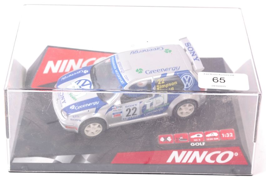 NINCO; Original Ninco 50243 Volkswagen Golf TDI ' Greenergy ' Scalextric style slot car, within the original box. NOTE; From an extensive private collection of contemporary Scalextric (and related 1:32 scale slot racing cars ). Each are generally in unused condition, each within the original cases / boxes, some with paperwork / spare parts. A fabulous collection. Buyers are reminded to satisfy themselves as to condition of individual lots prior to bidding.