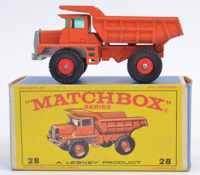 MATCHBOX LESNEY; An original vintage diecast model Matchbox Lesney No.28 Mack Dump Truck. Orange body, with red wheels Within the original box. NOTE: From a fabulous 'time capsule' find. Stored in a secret compartment within a desk from the day they were purchased, these models have only ever been removed from the box for our photography. As such, each model and box is virtually 'as new.' Condition of boxes is bright and colourful, and models are in original 'untouched' condition. Any potential bidders are still reminded to satisfy themselves prior to bidding as to condition, but on the whole, this collection is MINT.