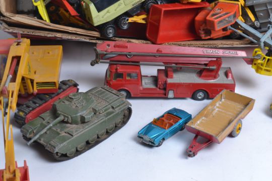 DIECAST; A good large box of assorted vintage diecast to include Corgi Carrimore, Dinky Buses, Matchbox, Husky Batmobile, Simon Snorkel Fire Engine and many others. A very good selection.