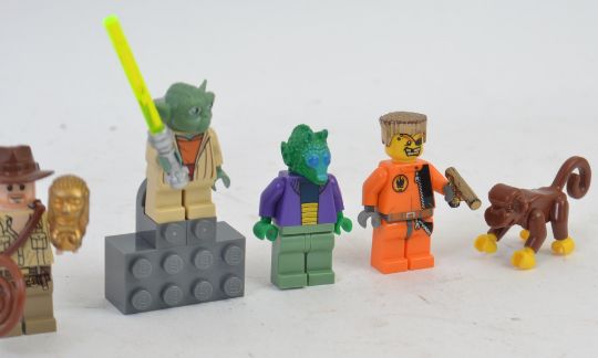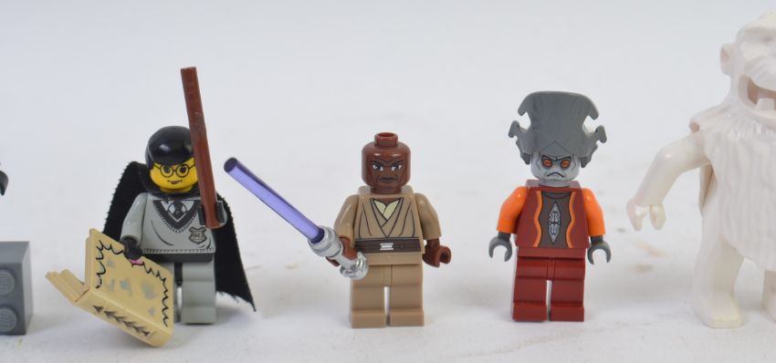 LEGO; A collection of 13x assorted rare / variant Lego Minifigures minifigs. To include Star Wars, Jar Jar Binks, Harry Potter, Mace Windu, Indiana Jones (light shirt), Greedo and others. Most with accessories.