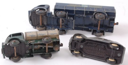 FRENCH DINKY; A good collection of 3x early Dinky French made diecast models; Tipper Truck, ' Societe Nationale ' Tractuer Panhard and a Citreon 2CV.