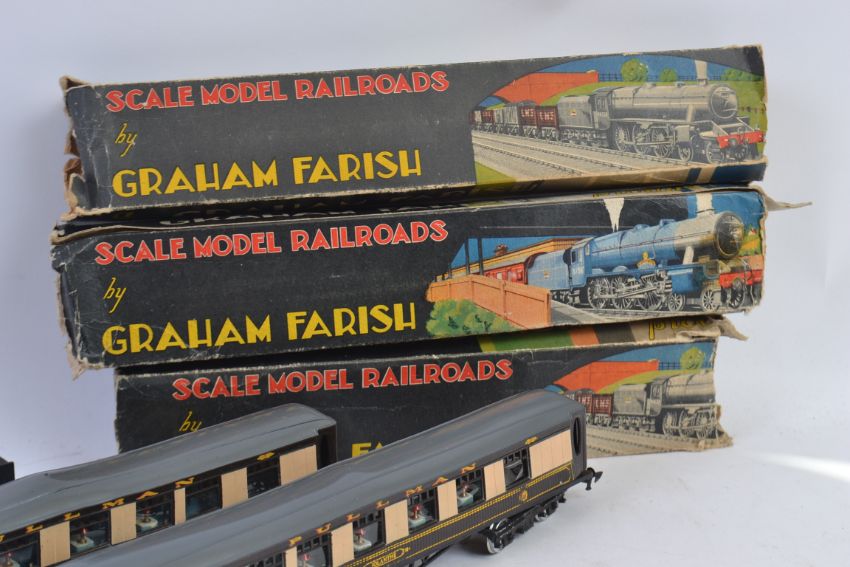 GRAHAM FARISH; A collection of three vintage Graham Farish 00 Gauge railway trainset pieces. Comprising of 2x Pullman carriages with shaped roofs, along with a black locomotive and tender. Each with an original box, although the carriages have incorrect boxes.