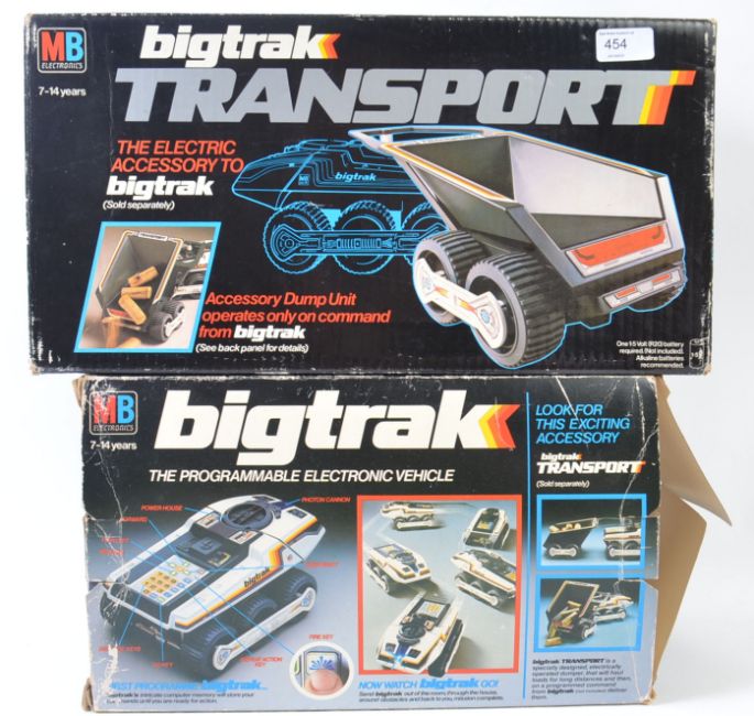 BIG TRAK; An original vintage retro MB Big Trak vehicle, within the original box, along with a Big Trak Trailer Transport, also within the original box.
