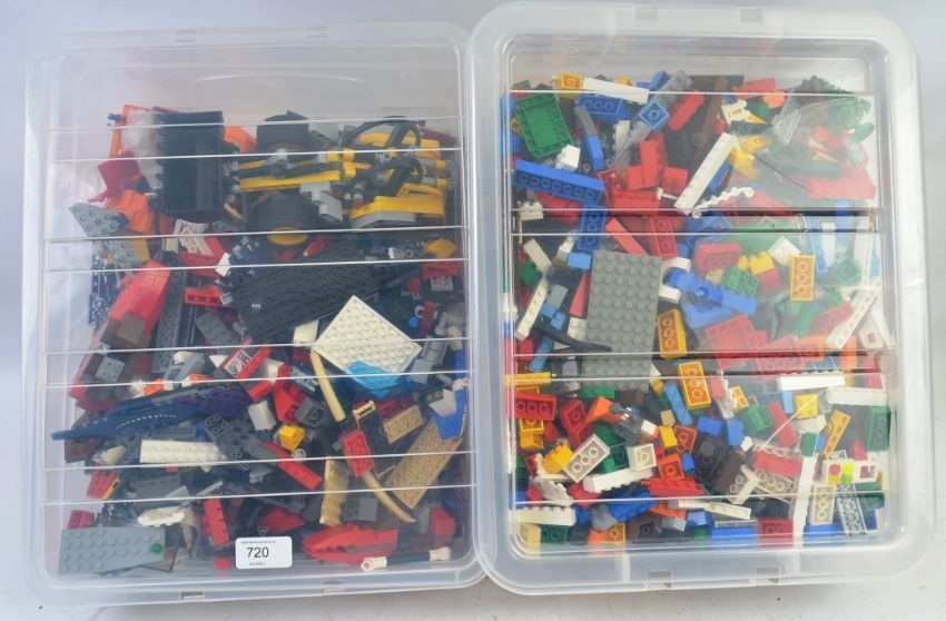 LEGO: Two crates of assorted loose vintage Lego to include various pieces, bricks and other items.