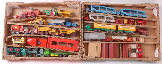 DIECAST; A collection of assorted vintage loose diecast to include Lesney, Matchbox King Size and various others. Including Lesney transporter, tractors etc. 2x trays.