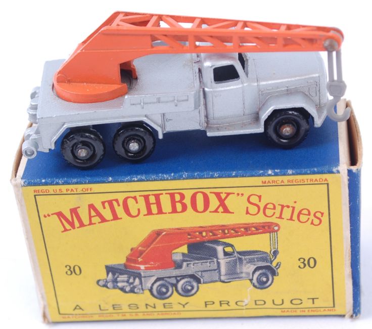 MATCHBOX LESNEY; An original vintage Matchbox Lesney diecast model 30 ' 6 Wheel Crane Truck '. Black plastic wheels, with orange crane. Within the original box.