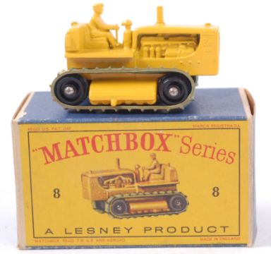 MATCHBOX LESNEY; An original vintage diecast model Matchbox Lesney No. 8 Caterpillar Tractor. Yellow, with black plastic wheels with the original tracks. Within the original box. NOTE: From a fabulous 'time capsule' find. Stored in a secret compartment within a desk from the day they were purchased, these models have only ever been removed from the box for our photography. As such, each model and box is virtually 'as new.' Condition of boxes is bright and colourful, and models are in original 'untouched' condition. Any potential bidders are still reminded to satisfy themselves prior to bidding as to condition, but on the whole, this collection is MINT.