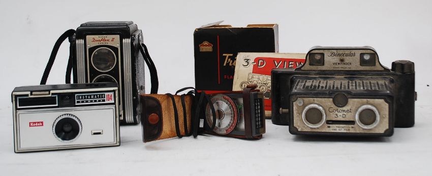A vintage Coronet binocular viewfinder together with a Kodak Dua flex II camera, Triumph Flashgun, Kodak Instamatic and a smaller boxed 3-d coronet viewfinder UK, European & Worldwide packaging available on all lots. Please see website www.eastbristol.co.uk for all details. Combined shipping available on all lots where possible.