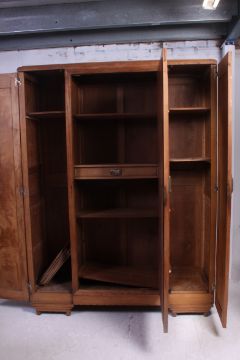A 1930's Art Deco oak triple wardrobe armoire having central mirror door with shelved and hanging interiors to each section. The body with angular design. Dismantles completely for ease of movement and transport