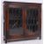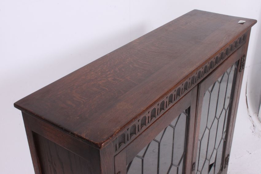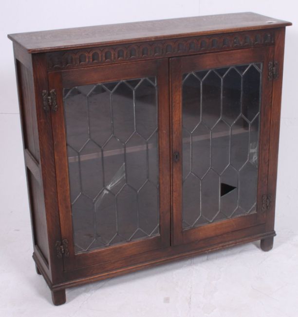 A jacobean style oak bookcase display cabinet having leaded glass with shelved interior. H92 x W94 x D28 cm