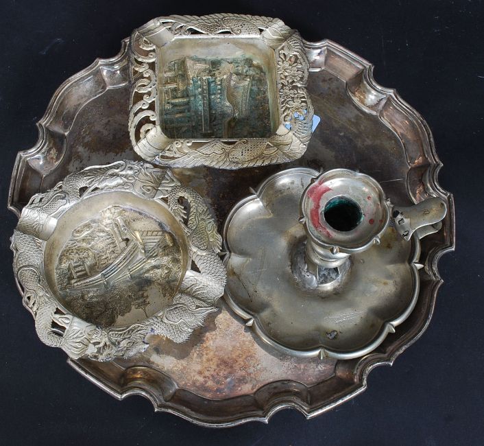 A collection of metalwares to include 2x Made In Occupied Japan brass dishes, a silver plated candlestick and a silverplated Bristol dish.