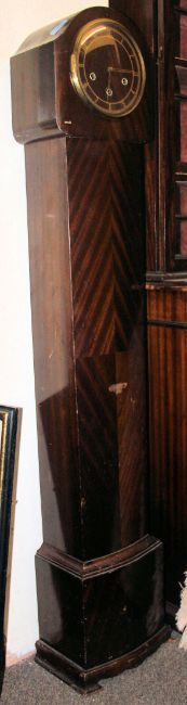 A 1930's Smiths Art Deco style granddaughter clock having raised dial over mahogany trunk. 155cm tall.