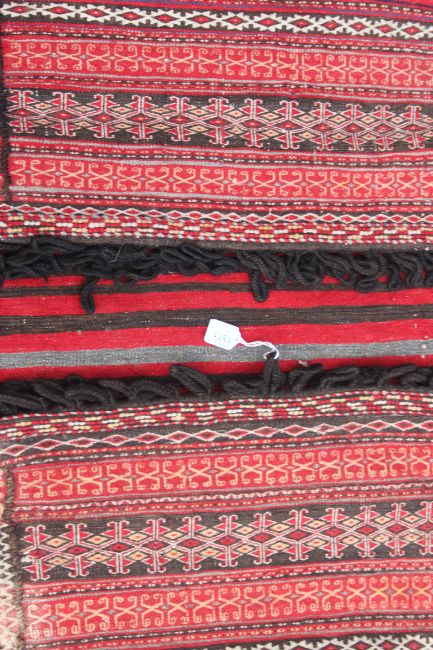 A circa 20th century Turkmen Saryk Khorjin - pair of Saddle Bags with geometric designs, tassled ends