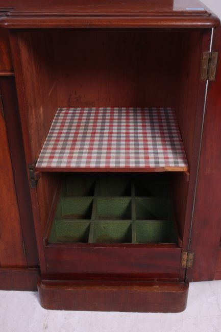 A Victorian inverted breakfront mahogany sideboard. Raised on a plinth base with a wide body of cupboards under short drawers above. Finished with a flared stub gallery top above.H76 xW68 x D44 cm