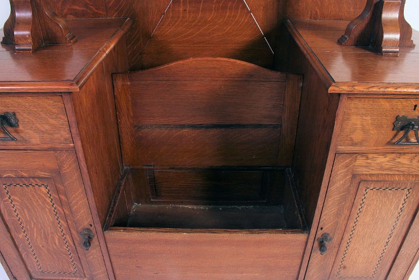 A late Victorian Arts & Crafts oak hall stand settle - coat stand. In the manner of Shapland & Petter. Made of solid oak having crossbanded herringbone inlaid details. Each pedestal with locker and short drawer with stunning large raised coat racks to each. To the centre is a settle seat with hinged top, to rear behind is a stick stand drip tray with mirror back upright having further original cast iron coathooks. Measures: 200 x 130 x 60