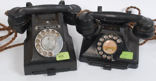 A vintage bakelite GPO call exchange telephone with ring dial - Stamped to underside GPO Batch Sampled 5415 - 312F S56/3A. Together with another bakelite phone stamped to underside GPPVD 2231 1/232F. TE46/1