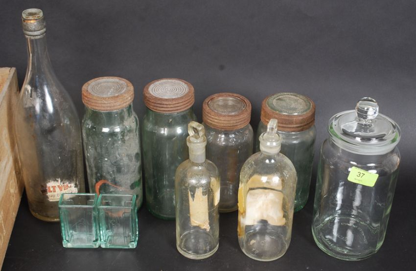 A collection of glassware to include vintage bottles, kilner jars and other items H24cm
