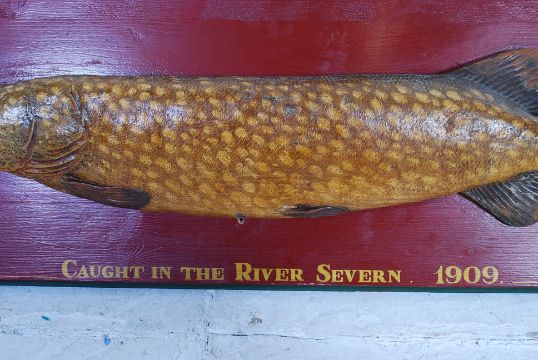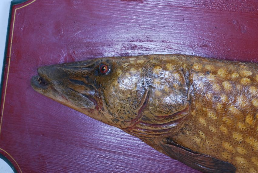 A large wooden faux taxidermy pike mounted onto an oversized wooden painted board with resin set pike to centre. Notation ' Caught in the River Severn 1907 ' H41 W 117cm