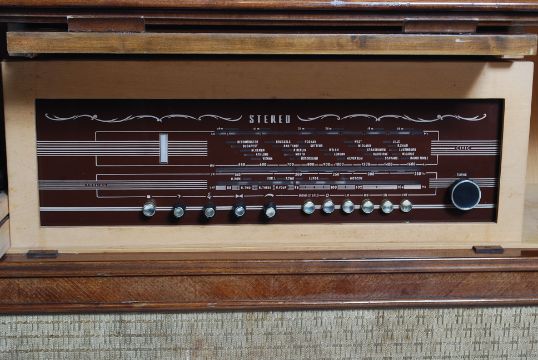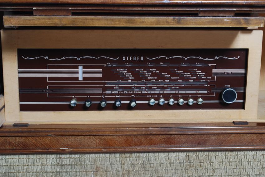 A 1960's walnut inlaid Stereogram - hi-fi cabinet having shaped legs with inset Garrard deck, radio etc over fabric speaker to base. Measures: 89 x 148 x 42