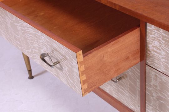 A 1950's melamine two tone vintage dressing table. Raised on tapered supports with shaped chest having wide mirror atop. Measures: 125 x 145 x 41
