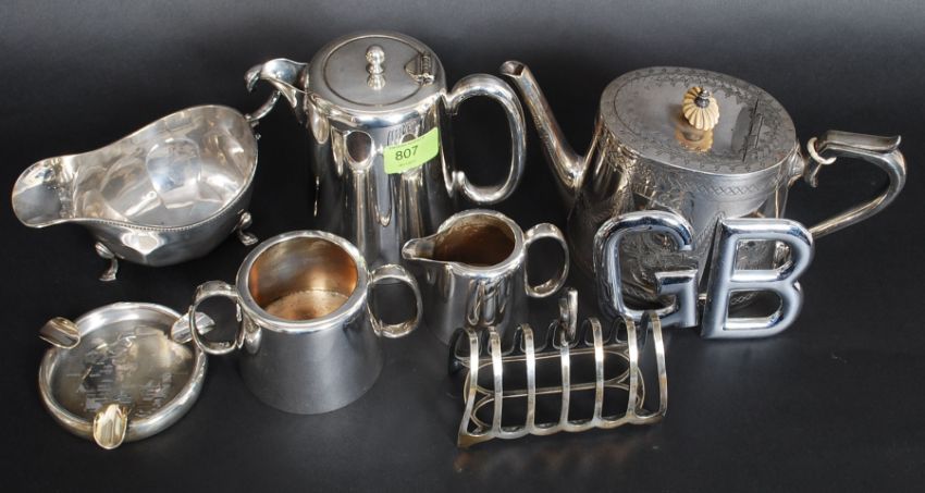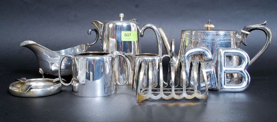 A collection of silver plated wares to include teapot, hot water pot, creamer, sugar bowl, small creamer, toast rack ashtray, GB car badges etc