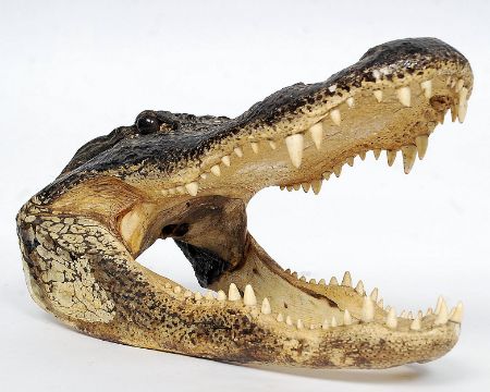 A large and impressive American taxidermy Alligator skull. Imposingly fixed with mouth open, teeth on display with inset eyes. 39cms long