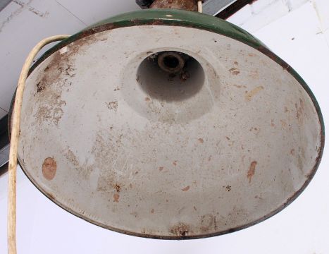 A Retro 1950's Industrial factory enamel painted metal pendant light lamp having original green and white finish