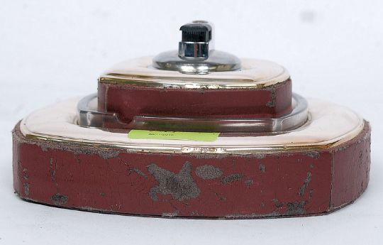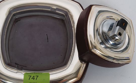 A fabulous silver 925 Ronson table lighter and ashtray combination. Each with burgundy leather surround, the ashtray and lighter surrounds both stamped 925. Lighter in working order W18cm