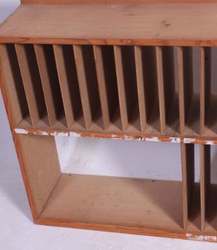 A large vintage 1950's Industrial pigeon hole stationary cabinet having plain sides with fitment panels ( see illustrations ) Measures: 74 x 222 x 27