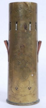 A World War One 1915 brass artillery shell converted to a floor vase bearing military markings to the base- crows foot etc H30cm