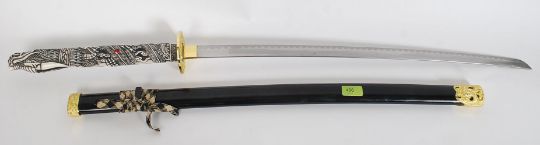 A replica ' Highlander ' sword having faux bone carved handle in the form of a dragon complete with scabbard. L110 cm