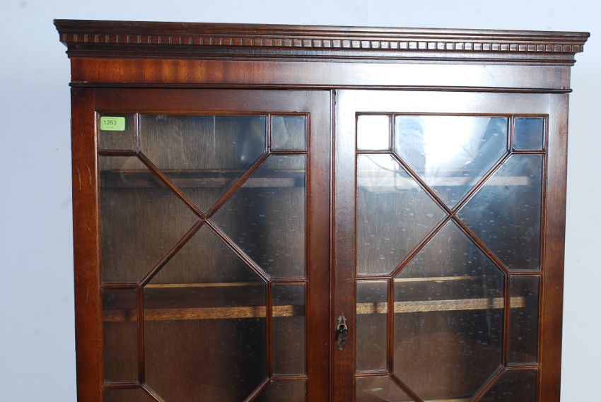 A Regency style flame mahogany library bookcase cabinet. Raised on bracket feet with cupboards under short drawers. Above a twin astragal glazed cabinet with shelves inside. Measure: 178 x 93 x 35.