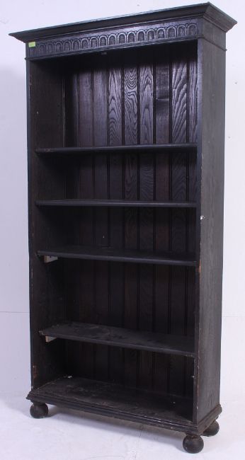 A large solid oak 20th century jacobean revival 6ft open window bookcase cabinet having carved dentil under flared cornice> Measures: 192 x 92 x 32.
