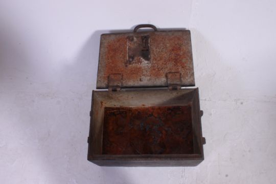 A 19th century Victorian strong box - coffer safe. The hinged top with Crown and R cypher with military crows foot arrow markings. Measures: 22 x 45 x 32.