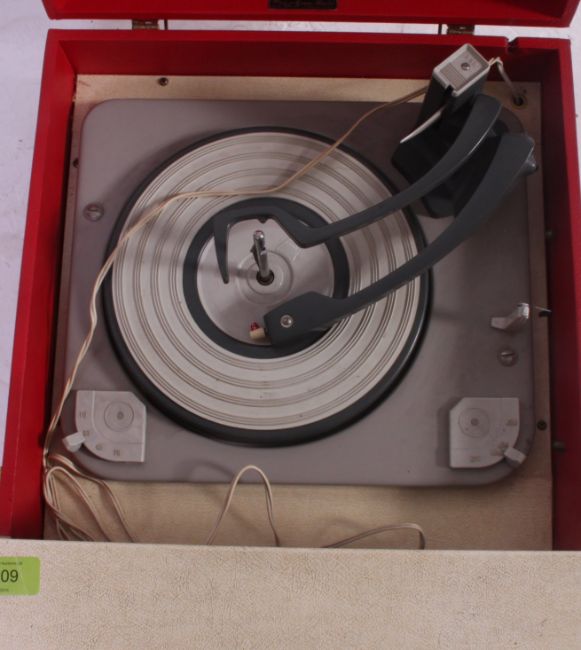 A 1950's Two tone Dansette portable record player - Dansette Major Deluxe 21 with original label to interior