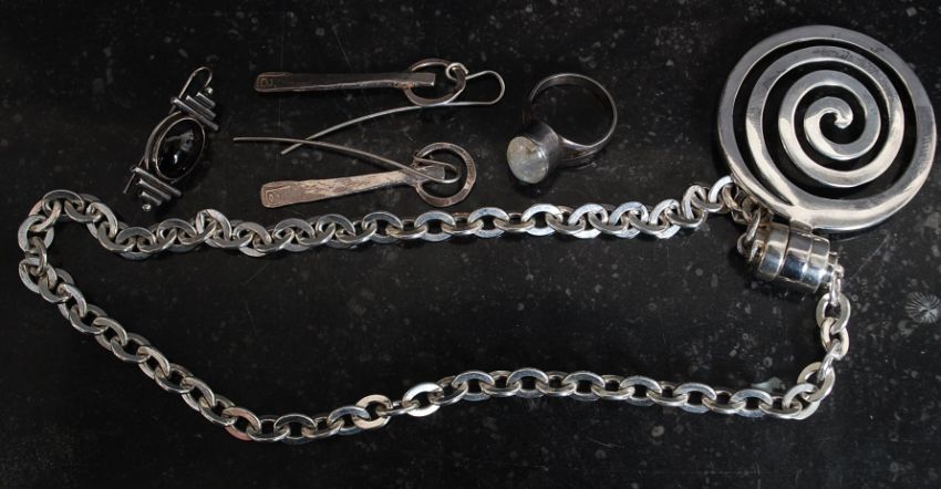 A heavy silver contemporary ladies necklace and pendant together with earrings, stone set brooch and a silver stone set ring. All stamped either 925 - silver. Total weight 78.1g