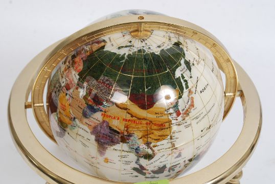 A Lapis Lazuli inlaid brass desk top revolving globe. Detailed globe set within pivot brass stand W33cm