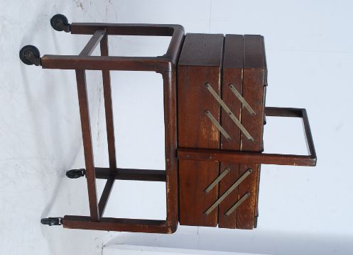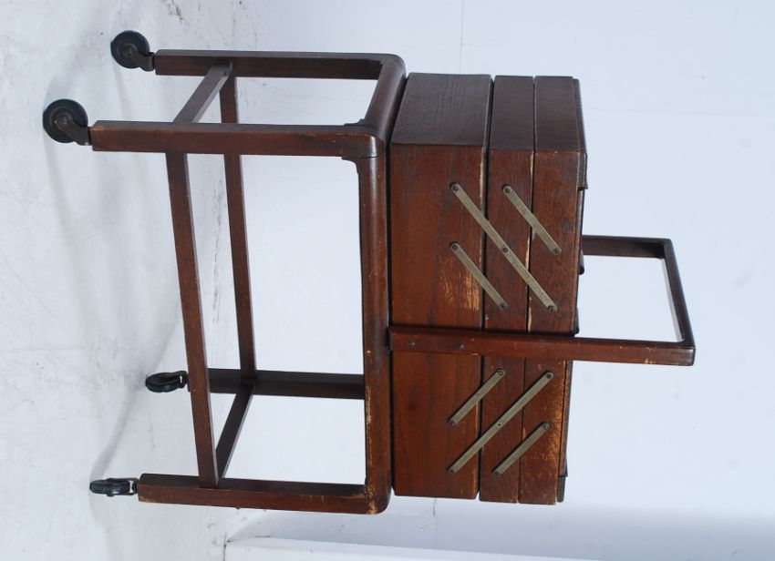 A vintage 1950's retro metamorphic sewing box raised on stand. The box with hinged sections, handles to centre. Measures: 75 x 52 x 30.