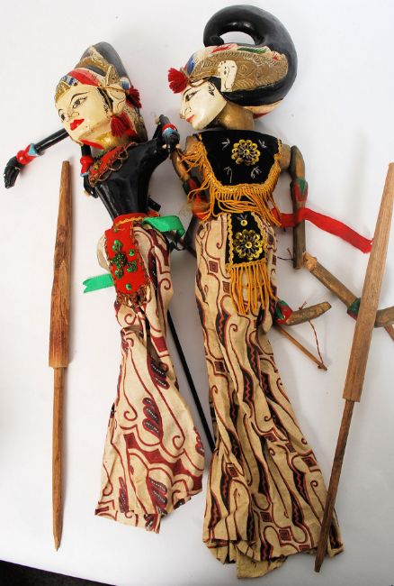 2 vintage 20th century Indian hand painted wooden puppets. Complete with clothes string and handles etc