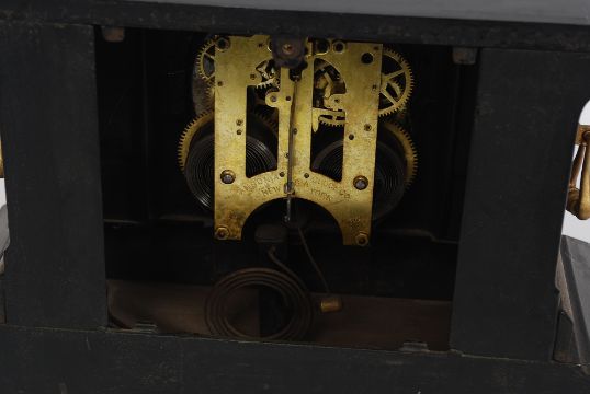 An early 20th century Victorian Ansonia Clock Co. slate style mantle clock, decorated with brass handles to the sides, and cast feet. With white enamel dial. H28 cm