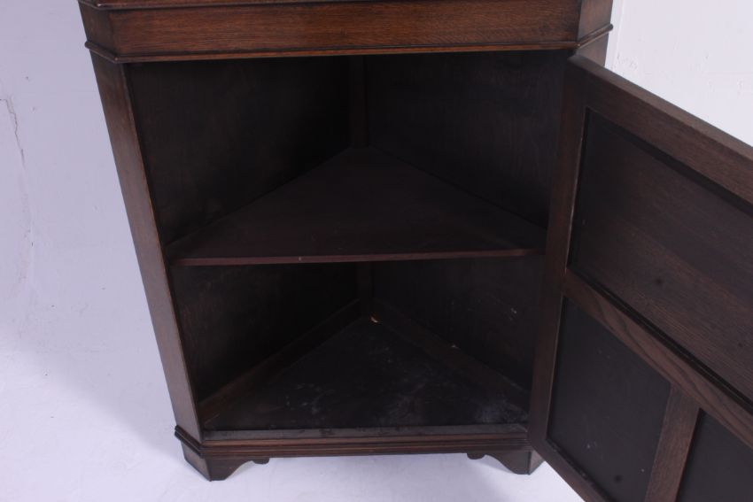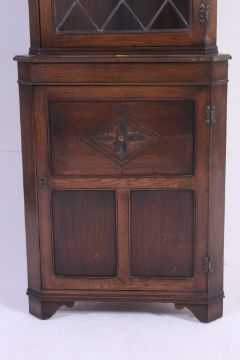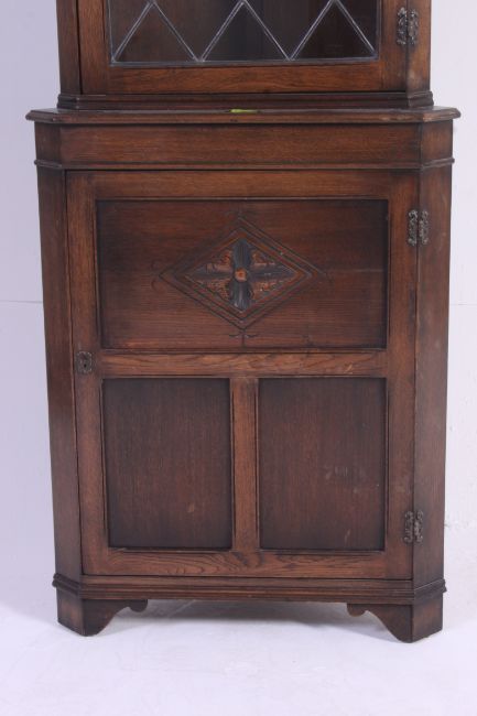 A Jaycee leaded glass quality oak Jacobean revival corner cabinet. Glass display cabinet over cupboard beneath. Jaycee label to the rear. Measures: 183 x 67 x 35