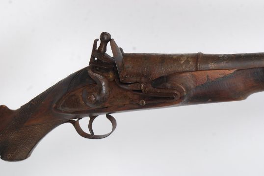 An 18th / 19th century Anglo - Indian Bandaq Matchlock musket The long heavy cast iron barrel being bound to the wooden ( rosewood ) stock. Large mechanism and trigger plate being unmarked, the stock with stamped no 1610 with further Indian markings 157cm long