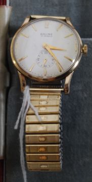 A vintage gentlemans Baume 17 Jewel 9ct gold hallmarked wristwatch set on a rolled gold flex strap. The face with baton numerals and subsiduary seconds dial. Complete with the original box and certificate No 7033. The verso with notation for Bristol Siddeley Engines