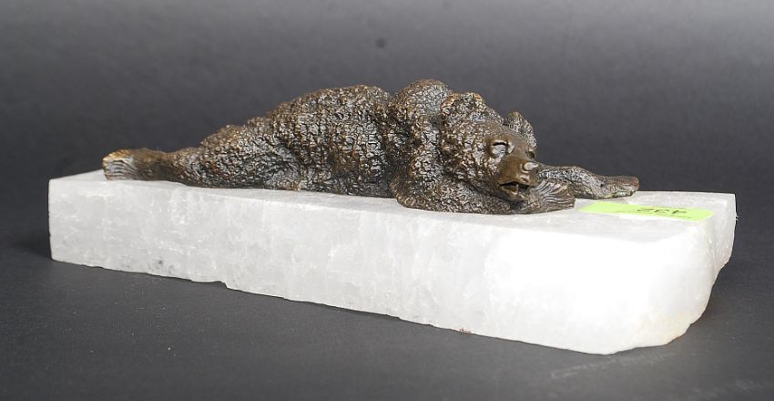 A Russian bronze and rock crystal figural sculpture, modelled as recumbent bear applied to a tapered piece of rock crystal simulating ic