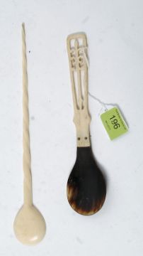 2 middle eastern late 19th century sherbet spoons, one with figural bone stem and horn bowl. The other ivory with barleytwist stem