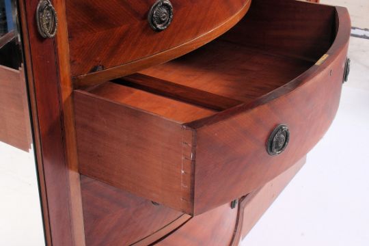 An Edwardian mahogany inlaid bow front triple wardrobe armoire compactum. The triple having twin mirror door sentry box wardrobes flanking a central bow front cupboard with chest of drawers beneath. Dismantles into 5 pieces for ease of movement. Part of a suite we also have the matching kneehole desk, dressing table, bedside cabinet and bedroom chair in lots 1366, 1367 & 1384 Measures: 210 x 197 x 70