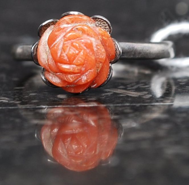 A silver vintage ladies coral flower head ring having silvered flower leaf mount